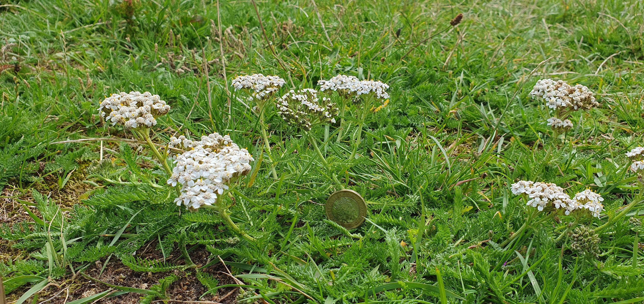 Achillea millefolium in the lawn. Yarrow has a characteristic known as plasticity of form. Here it is growing in a mown lawn where it is not much taller than the pound coin I added for reference. It can change its form in response to environmental influences such as mowing by remaining low growing in lawns. As shown, it can produce flowers even in its height-reduced state. In garden borders without the influence of the mower it can grow to over a metre tall.