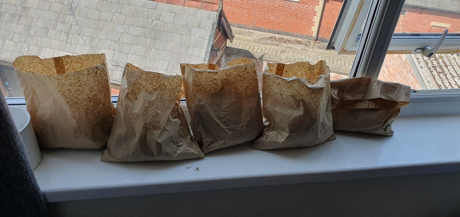 Anyway, leaving plenty of seed heads still in place, I managed to collect a handful of paper bags worth, and at home put them on a windowsill to catch the sun and dry out. The drying out being important to induce ripened seed pods to crack open and release their mature seeds.