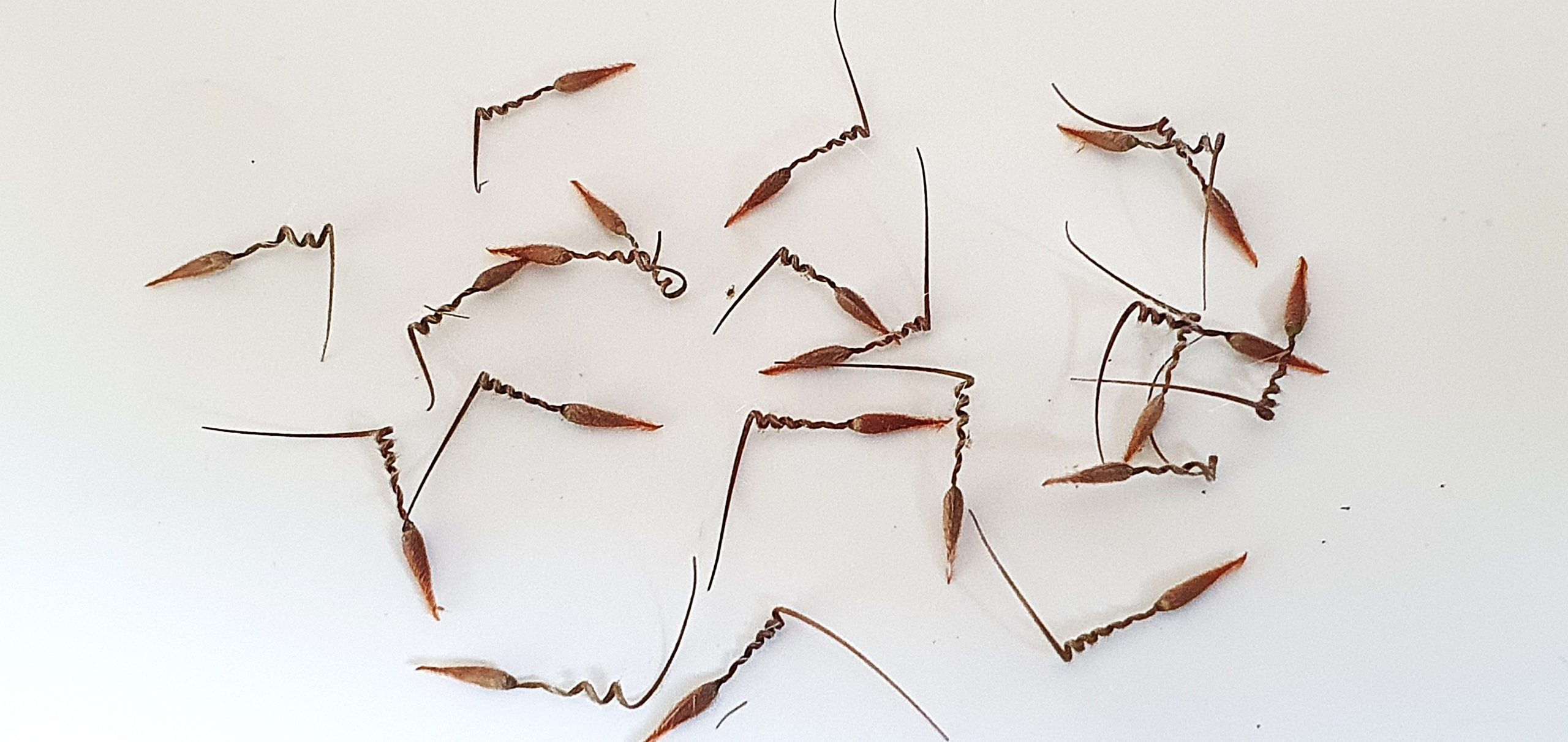 Close-up of one of the seeds (composite image). The type of seed head on Stork's-bills is known as a "schizocarp". They split into multiple parts when mature, each containing a seed. These seed heads are often long and pointed, resembling a stork or heron's bill. The corkscrew seeds are moisture sensitive and will literally screw the seed into the ground when there is sufficient moisture. Another garden border-worthy species (E. gruinum) has seeds so sensitive to humidity that it is commercially used for making hygrometers (that measure humidity).