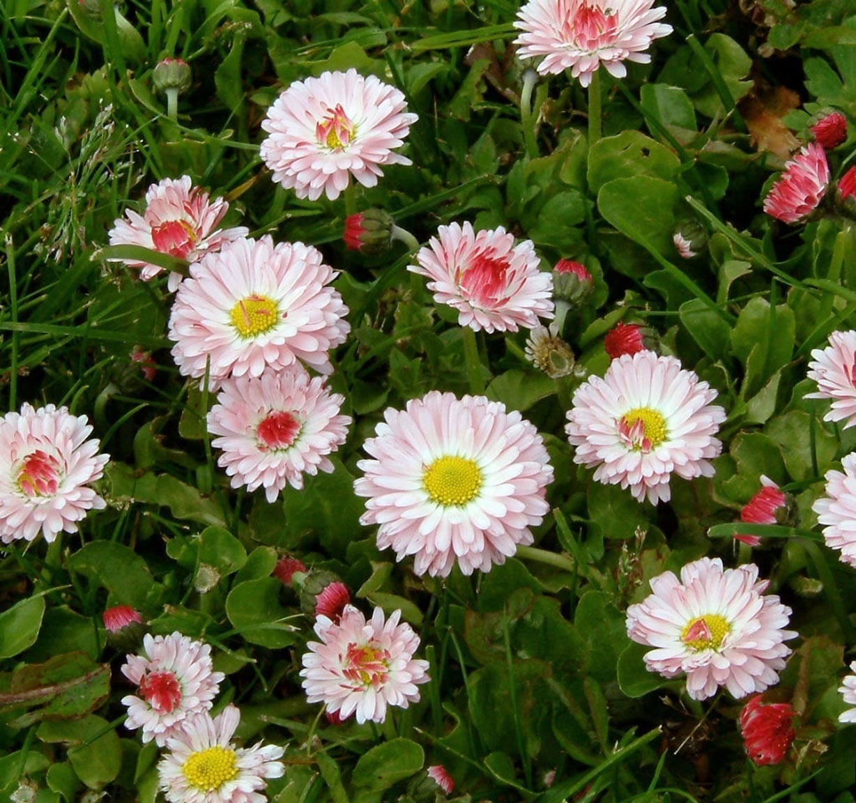 The native geographical range of the common lawn daisy (Bellis perennis) includes the UK, and from the wild form have been bred cultivars with double and semi-double flowers that may be pure white, pink or red. There once were even golden-leaved forms and purple/lilac floral forms, but they are now lost to cultivation; lawn 'weeds' not being previously much valued.