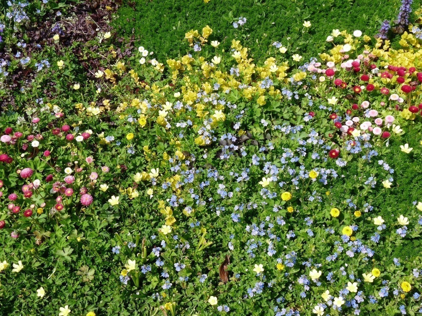 T-lawns use many common British natives, often both their wild form and their ornamental cultivars, e.g. Bellis perennis (common lawn daisy) and its cultivar Bellis perennis 'Robella' as shown below.