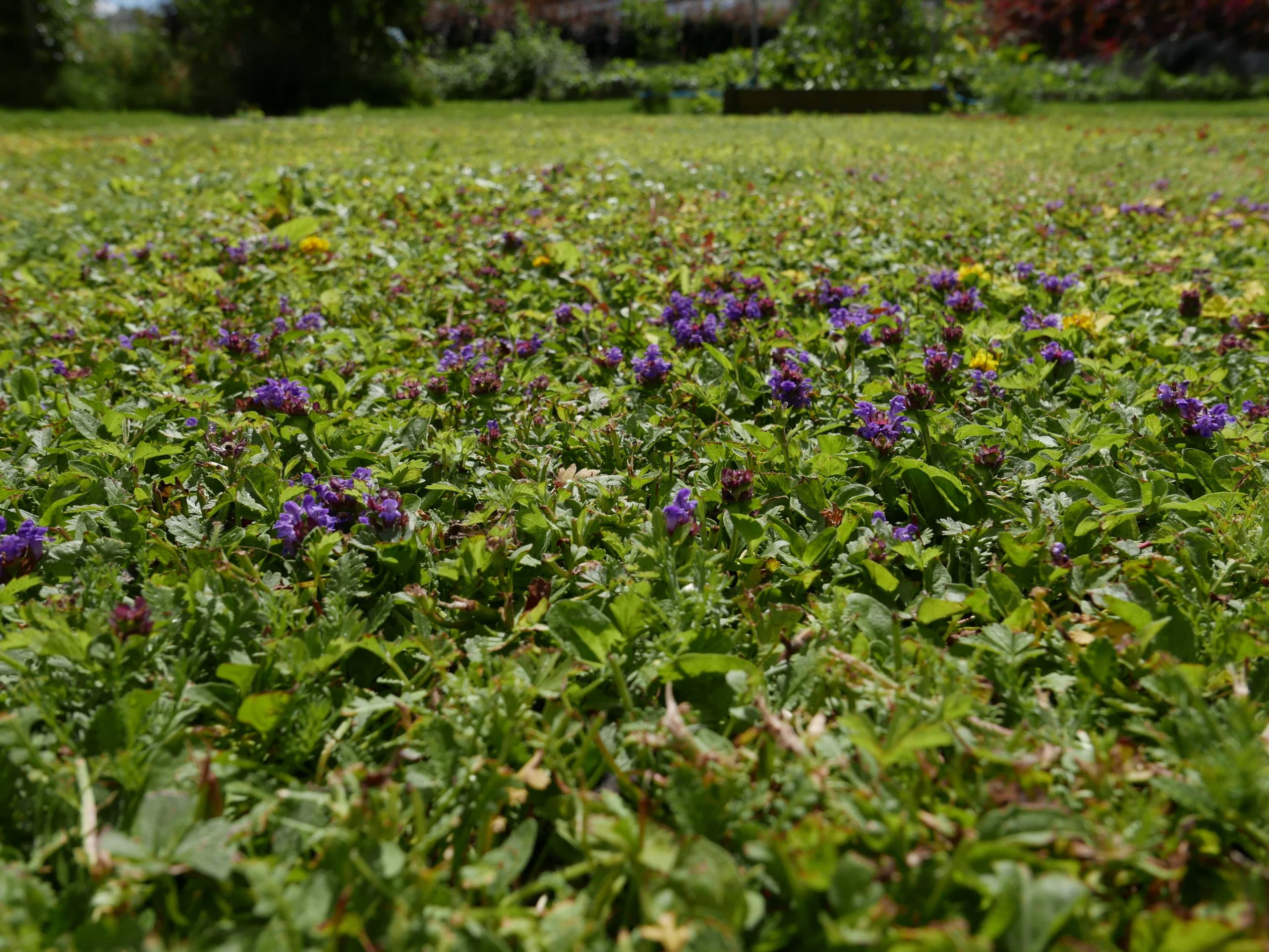 A recently mown T-lawn. Shorn of its most prominent flowers the look and feel of a T-lawn can be quite different as it is returned to looking like a more familiar low-cut lawn form. Fortunately just like daisies in any turf lawn, flowers are usually back within a few days and a new-looking lawn will present itself.