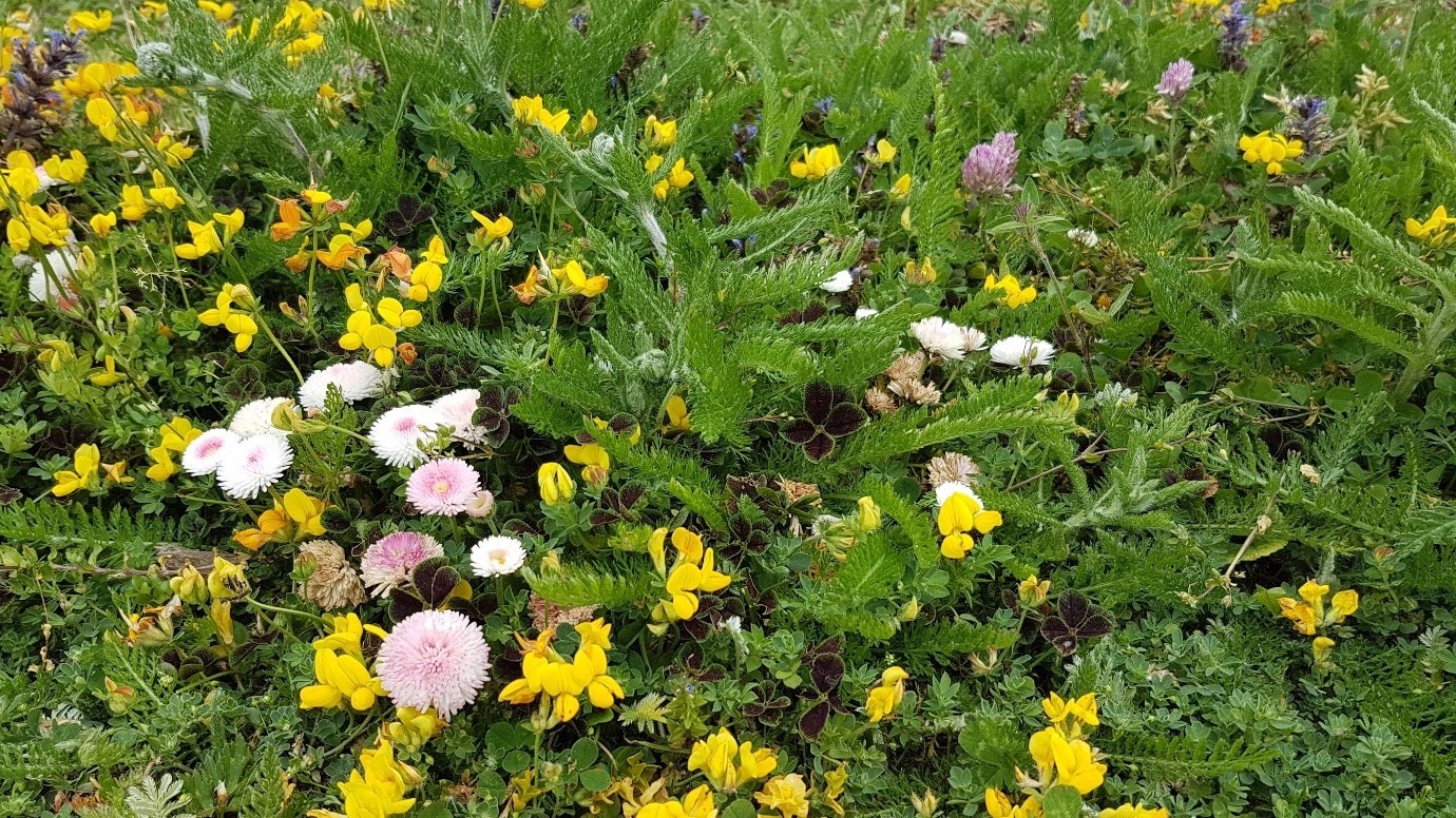 Lucky T-lawns it would seem, or did a canny gardener include the white clover nativar Trifolium repens '"Dark Dancer"™ in the planting mix?