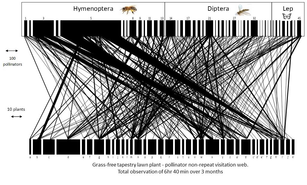 However, the complexity of the interaction is better shown by plant-pollinator webs, as shown below. There is much more activity undertaken by many more pollinators and pollinator species when interacting with T-lawns.