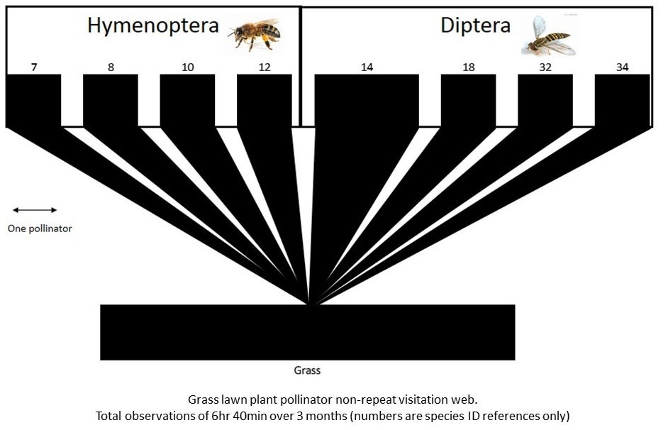 Plant-pollinator web showing the nine bee & hoverfly visits to grass-only lawns. No butterflies visited. 1cm top width = 1 pollinator